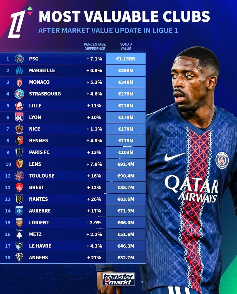德转列法甲俱乐部身价排名:巴黎超11亿欧断崖领先,马赛第2
